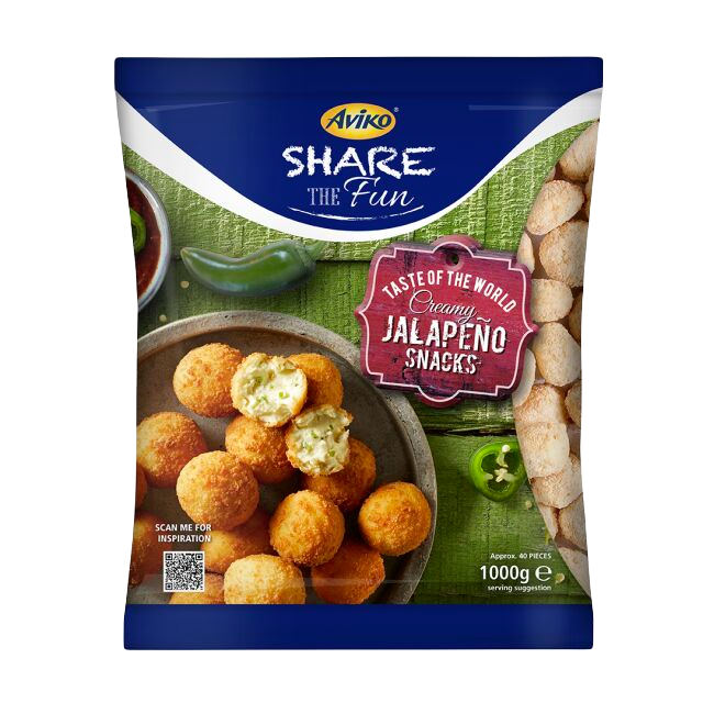 Ce snack est rempli de fromage frais et de morceaux de piment vert, recouvert de chapelure croustillante, précuit et surgelé.