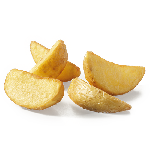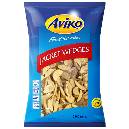 Aviko Jacket Wedges quartiers de pommes de terre avec peau. La peau donne aux pommes de terre un aspect artisanal.